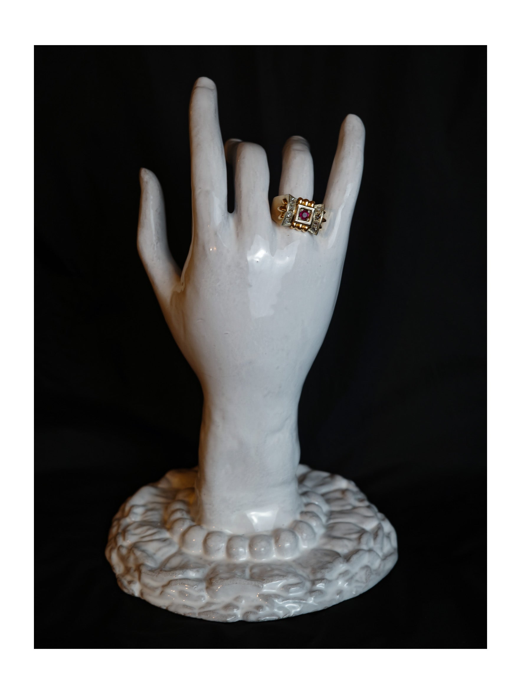 1940年代に精巧に作られた当時の一点物リング。温かみのある18kローズゴールドに、深みある輝きを放つルビーがセットされています。洗練された建築的フォルムがアールデコ期の優雅さを体現し、時代を超えた気品と職人技を感じさせる逸品です。