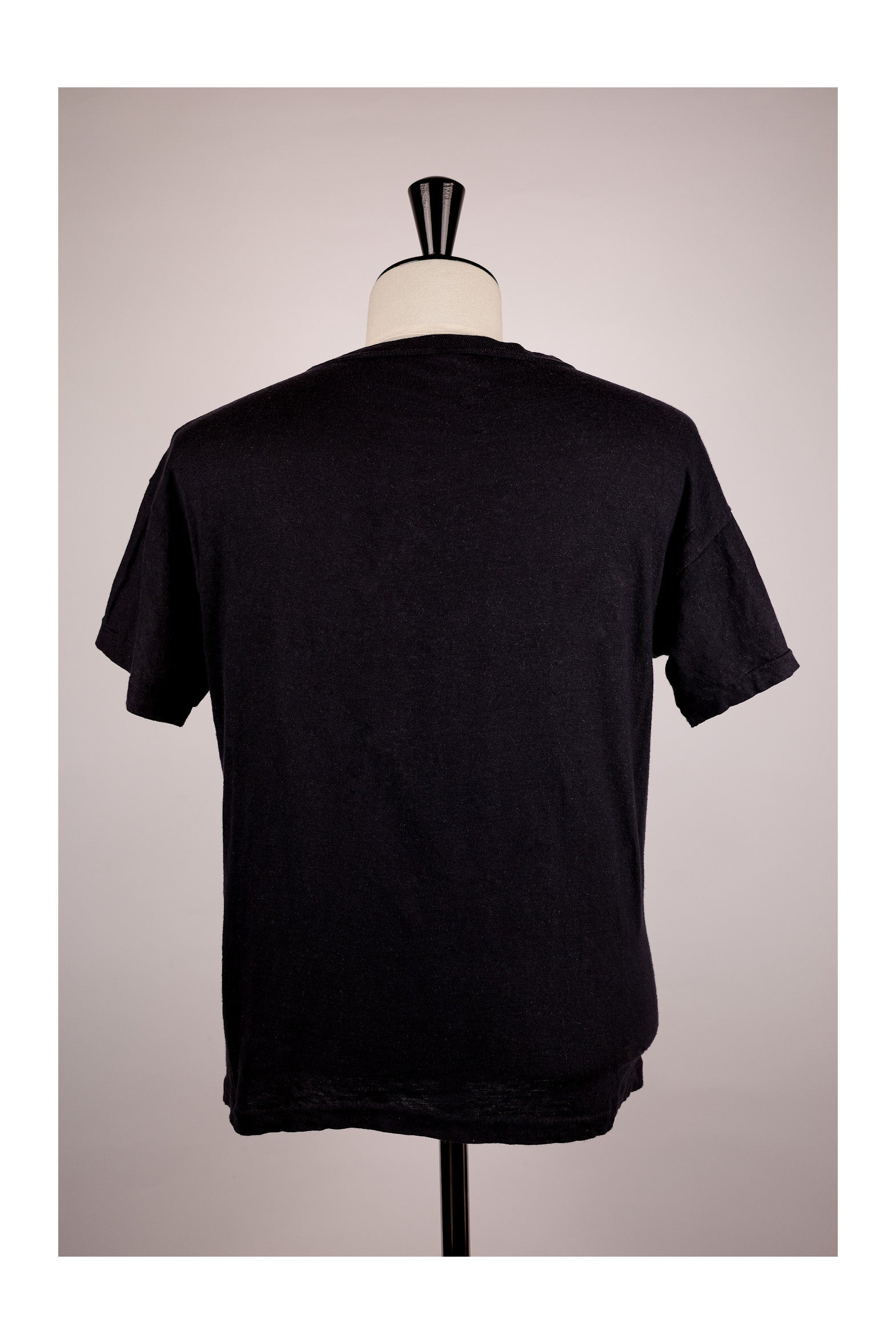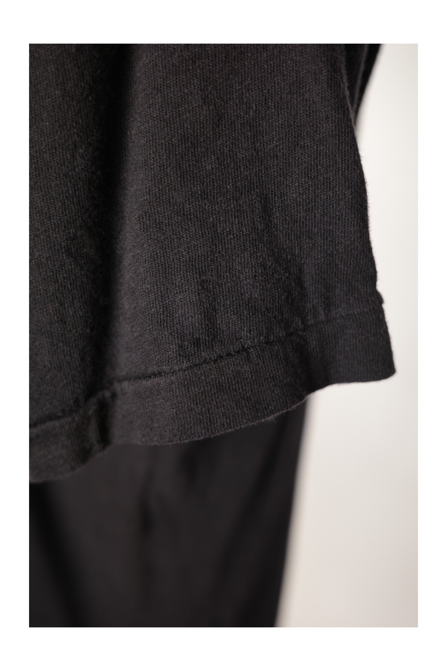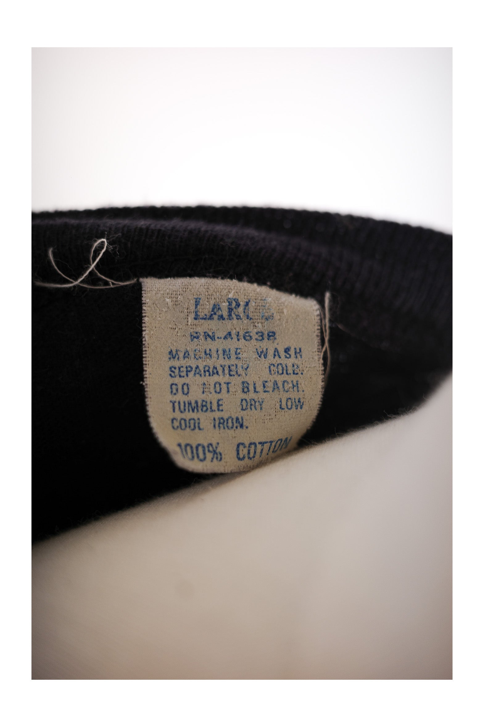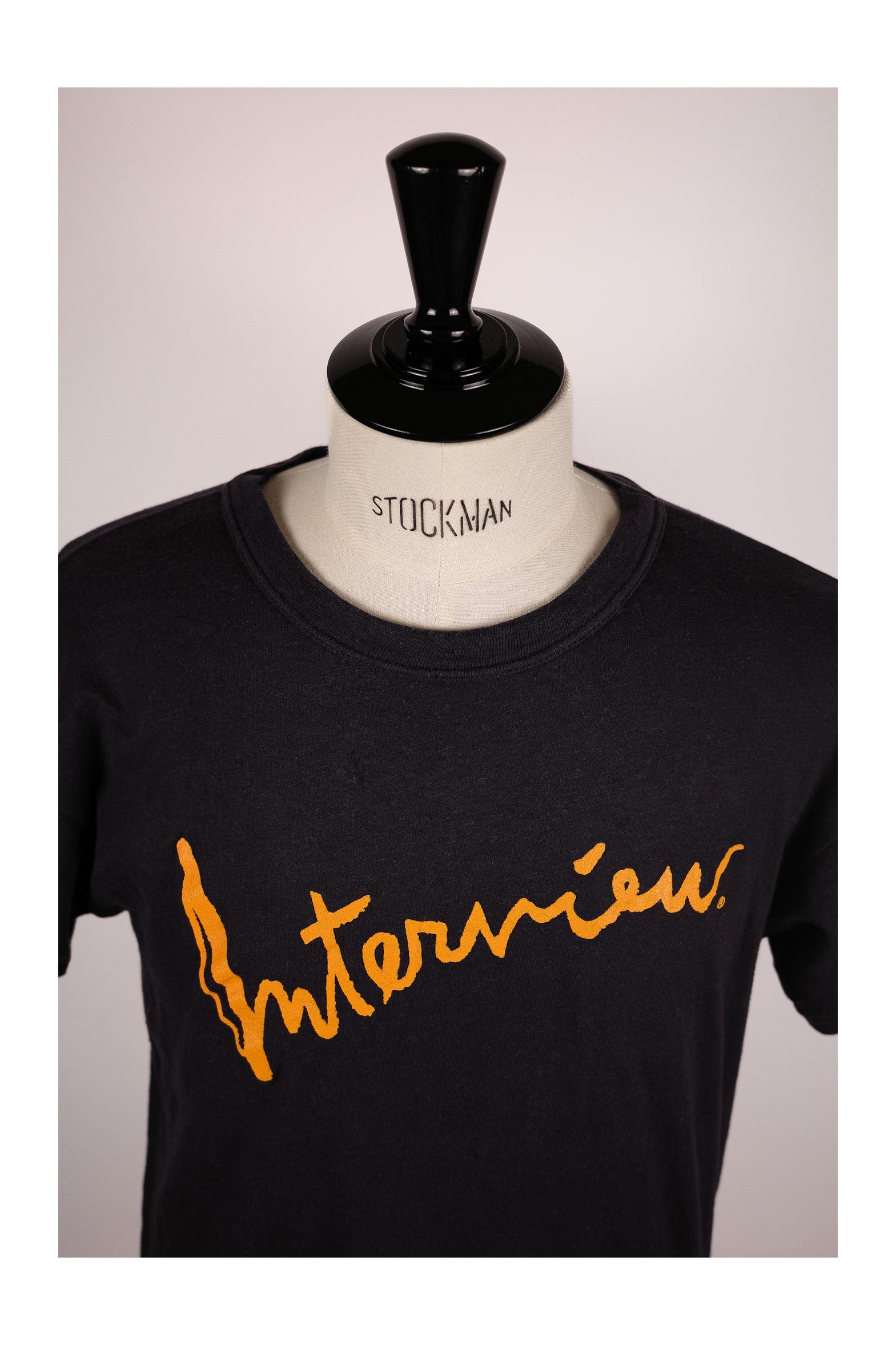 アンディ・ウォーホルが創刊した雑誌「Interview」のロゴを配した一枚。手書きのようなオレンジのスクリプトは、当時のポップカルチャーを象徴するアイコンのひとつ。1969年の創刊以降、アート、音楽、ファッションを横断しながら時代の中心を記録してきたInterview。本個体はタグやボディの仕様から、1970年代初期頃のものと推定されます。フェードしたブラックと経年によるプリントの表情が重なり、単なる衣服を超えた“カルチャーの断片”としての存在感を持つ一着。コレクションピースとしても魅力的なヴィンテージです。